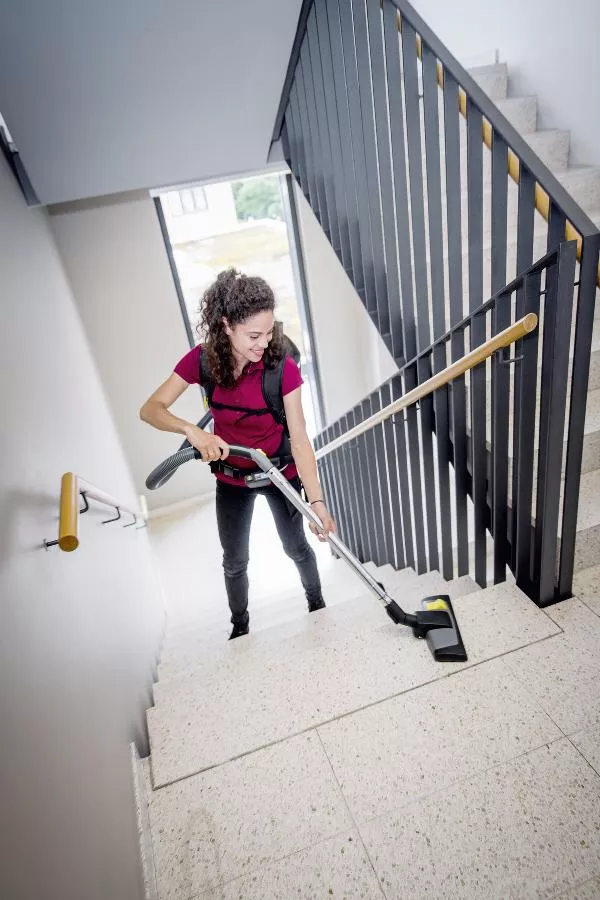 - Avec sa puissance de 500 watts, la longue autonomie de la batterie et une cuve à déchets de 5 litres, cet aspirateur dorsal est le meilleur choix pour tous les endroits où le manque de place complique les tâches de nettoyage – que ce soit au cinéma, dans l’avion, le bus ou le train, lors du nettoyage de bureaux ou encore dans les escaliers.