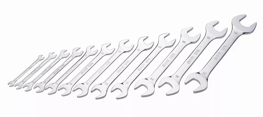 Jeu de 12 clés à fourche forgées en acier au chrome vanadium.