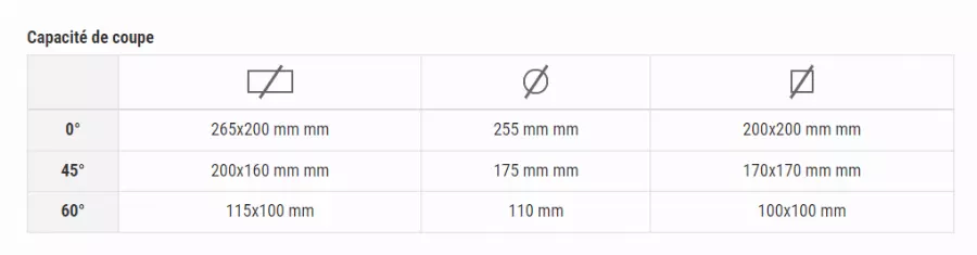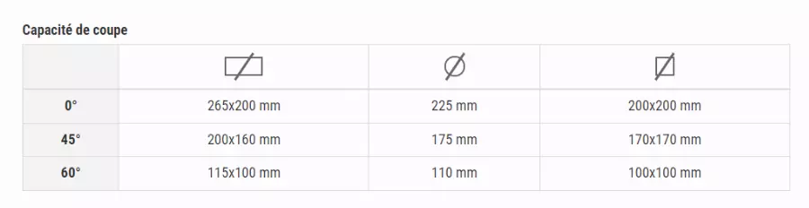 - Angle de coupe règlable de 0° à 60° gauche avec butée à 45° et 60°